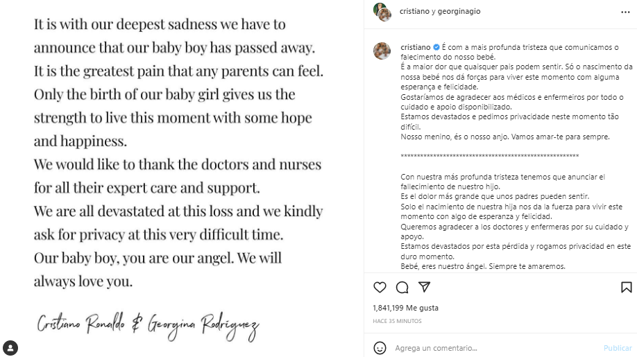 Bebé, eres nuestro ángel. Siempre te amaremos.Cristiano Ronaldo y Georgina Rodríguez. «