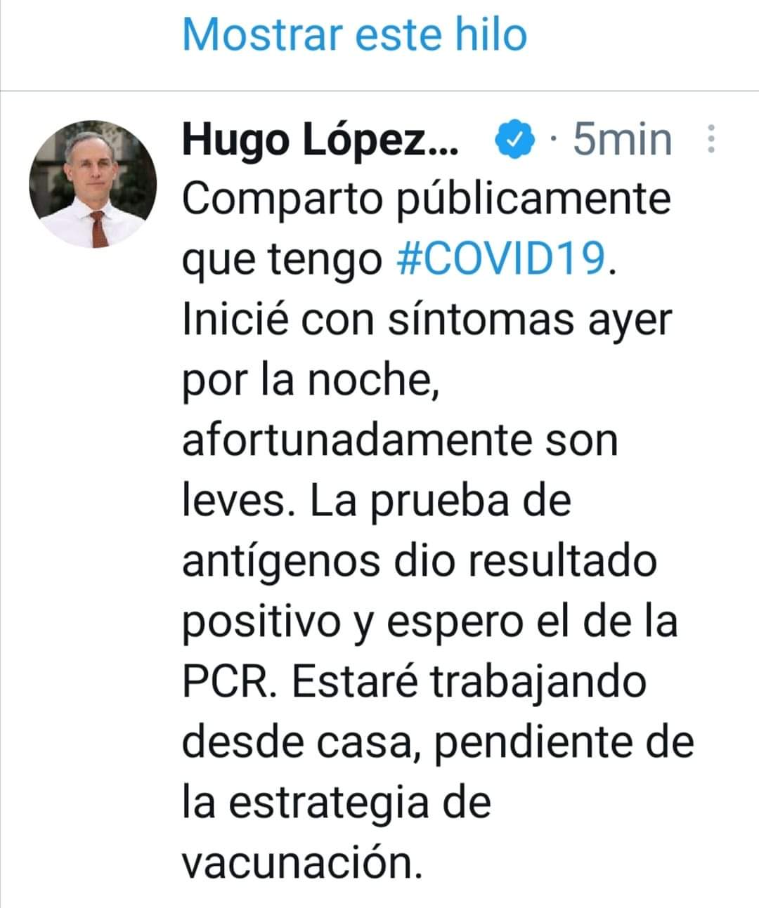 «Comparto públicamente que tengo #COVID19. Inicié con síntomas ayer por la noche, afortunadamente son leves. La prueba de antígenos dio resultado positivo y espero el de la PCR. Estaré trabajando desde casa, pendiente de la estrategia de vacunación», difundió en su cuenta de Twitter.