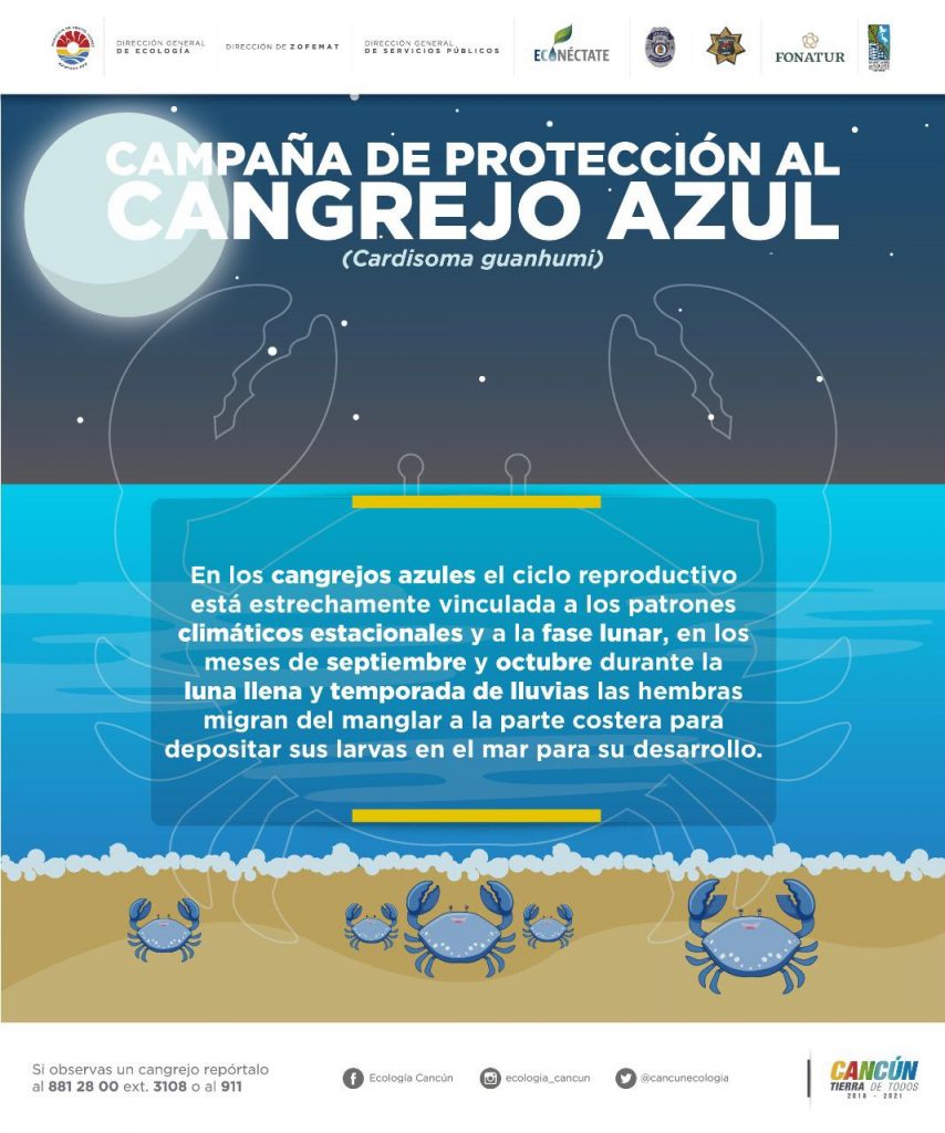 Principalmente, este 31 de agosto y 1 de septiembre, habrá luna llena, por lo que las hembras del cangrejo azul se van a trasladar del manglar hacia el mar; por lo que se pidió que si transitan por Av. Kukulcán a la altura de la entrada a Puerto Cancún, Playa Las Perlas, Playa Coral y Nizuc, tomes tus precauciones y disminuyas tu velocidad.