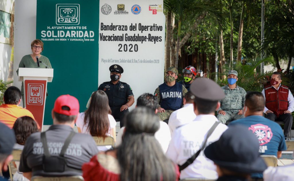Playa del Carmen, Q. Roo, Sábado 05 de Diciembre de 2020, poderycrítica.- Con la presencia de titulares y representantes de las corporaciones de seguridad pública de los tres niveles de gobierno -Guardia Nacional, Bomberos, cuerpos de emergencias y Protección Civil-, la presidenta municipal, Laura Beristain Navarrete, dio el banderazo de inicio del “Operativo Vacacional Guadalupe-Reyes 2020”, donde participan más de mil elementos para reforzar la seguridad, atención a los turistas y la ciudadanía en general.