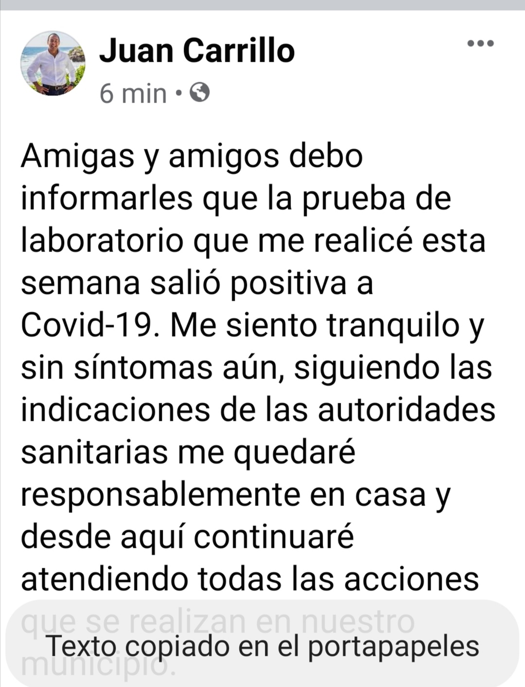 Isla Mujeres, julio 26.- El presidente municipal de Isla Mujeres, Juan Carrillo, dio positivo a Covid 19.