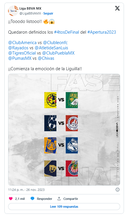 El líder indiscutible del torneo Apertura 2023, las Águilas del América, fueron la última escuadra en conocer a su rival en la ronda de Cuartos de Final, ya que, el León, octavo clasificado en la fase regular, aseguró su participación en la liguilla tras superar a Santos Laguna en el tercer duelo del Play-In, sentenciando así el cruce entre azulcremas y esmeraldas, primero en el Nou Camp y cerrando en el Estadio Azteca.