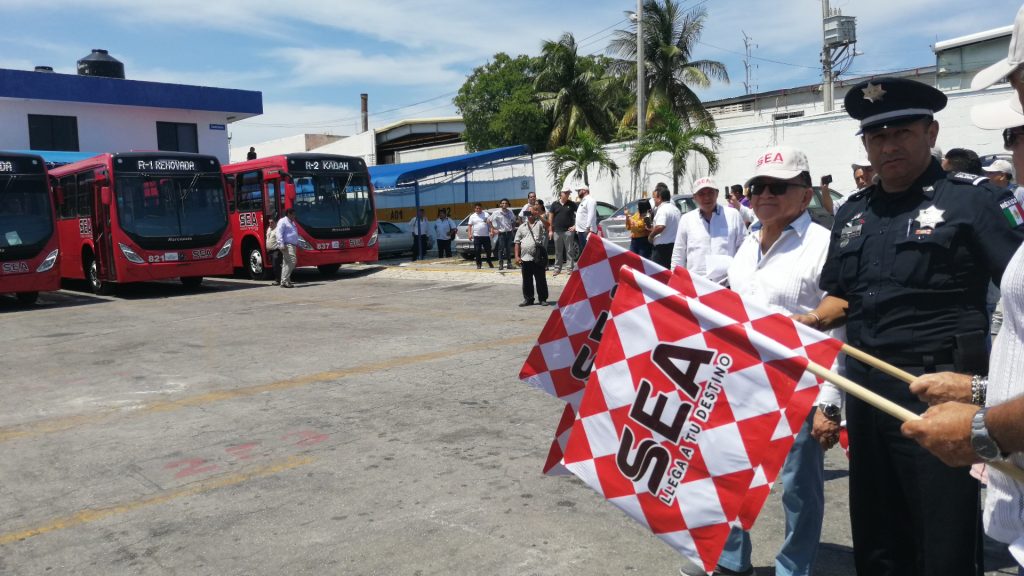 Cancún, Quintana Roo, martes 14 de agosto.- Este martes en las instalaciones de Autocar se dio el banderazo de salida para las primeras 65 unidades de la empresa Servicios Empresariales Ecológicos y Administrativos para el Autobús (SEA).