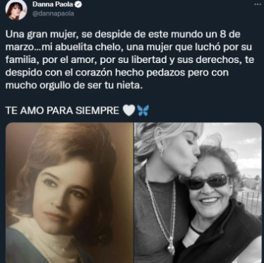 “Una gran mujer, se despide de este mundo un 8 de marzo…mi abuelita Chelo, una mujer que luchó por su familia, por el amor, por su libertad y sus derechos, te despido con el corazón hecho pedazos pero con mucho orgullo de ser tu nieta.”, escribió Danna en su tuit.