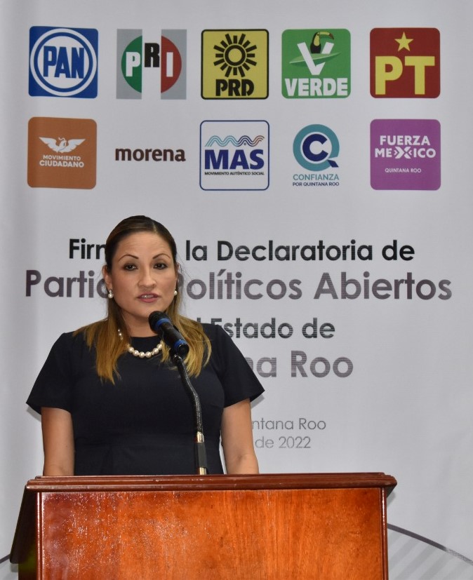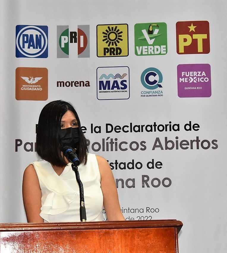 Al hacer uso de la voz, la Consejera Presidenta del Instituto Electoral de Quintana Roo (IEQROO), Mayra San Román Carrillo Medina señaló que, con la Firma de la Declaratoria de Partidos Políticos Abiertos, se potencializa la transparencia y damos cabida a un acercamiento libre y de innovación; fomentando el debate, para que ellos con base a la información proporcionada por los que contienden a un cargo público, puedan dirigir hacia quién emitir su voto.