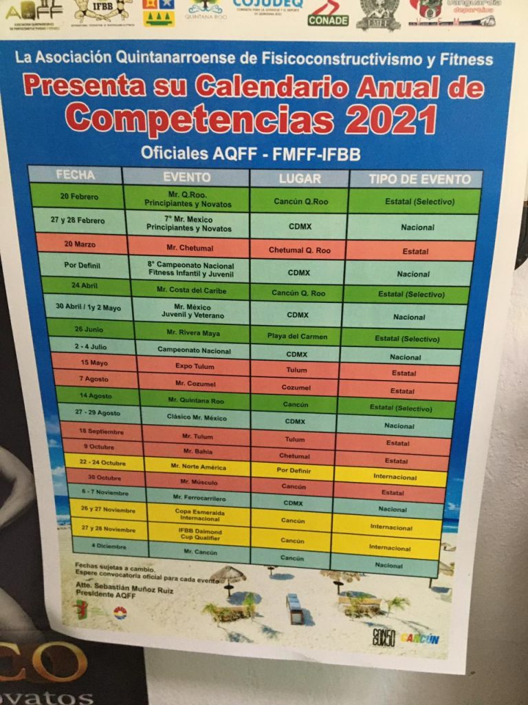 Cancún, Q. Roo, sábado 23 de enero de 2021, poderycrítica.- La primera competencia será el Mr. Quintana Roo Principiantes y Novatos a disputarse el 20 de Febrero en Cancún, que además fungirá como selectivo estatal.