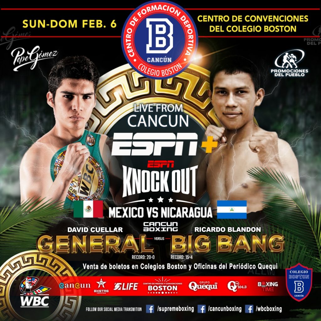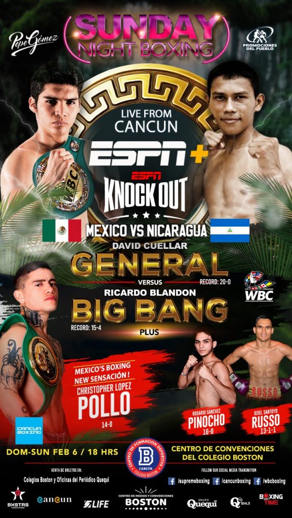 La explosiva cartelera que presentan en alianza “Cancun Boxing” de Pepe Gómez, “Promociones del Pueblo”, de Oswaldo Küchle, y “Boxing Time Promotions” de Guillermo Rocha, llegará en directo desde el Colegio Boston a toda América Latina, Estados Unidos, Puerto Rico y Canadá a través de la señal de ESPN Knock Out, además del Canal “Total Knock Out WBC” y vía streaming mediante diversas páginas de Facebook Live.