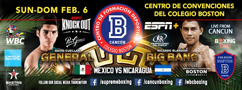 La explosiva cartelera que presentan en alianza “Cancun Boxing” de Pepe Gómez, “Promociones del Pueblo”, de Oswaldo Küchle, y “Boxing Time Promotions” de Guillermo Rocha, llegará en directo desde el Colegio Boston a toda América Latina, Estados Unidos, Puerto Rico y Canadá a través de la señal de ESPN Knock Out, además del Canal “Total Knock Out WBC” y vía streaming mediante diversas páginas de Facebook Live.