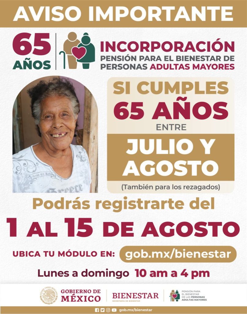 Poder y Crítica | Redacción | El Gobierno de México, a través de la Secretaría de Bienestar, informa que del 1° al 15 de agosto está en curso la nueva etapa de registro para solicitar la incorporación a la Pensión para el Bienestar de las Personas Adultas Mayores, para quienes cumplen 65 años entre los meses de julio y agosto.
