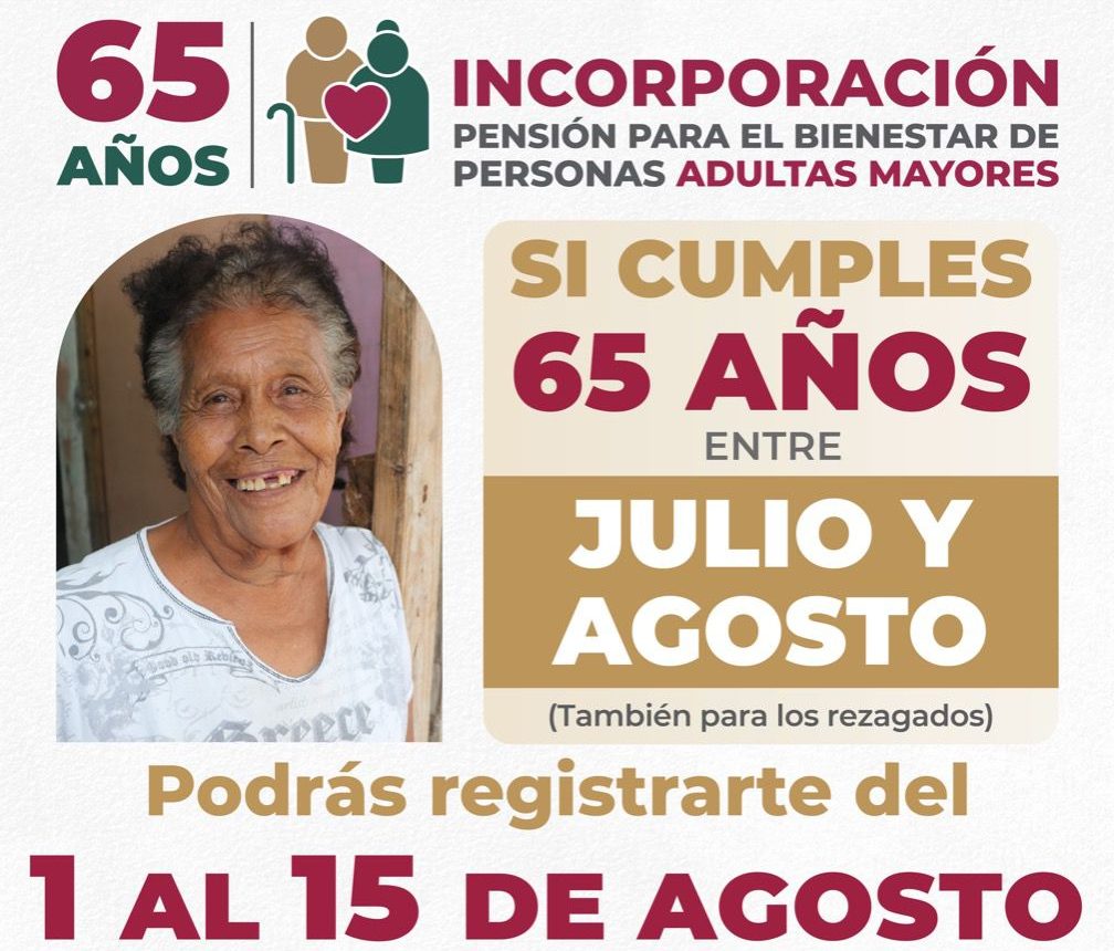 Poder y Crítica | Redacción | El Gobierno de México, a través de la Secretaría de Bienestar, informa que del 1° al 15 de agosto está en curso la nueva etapa de registro para solicitar la incorporación a la Pensión para el Bienestar de las Personas Adultas Mayores, para quienes cumplen 65 años entre los meses de julio y agosto.
