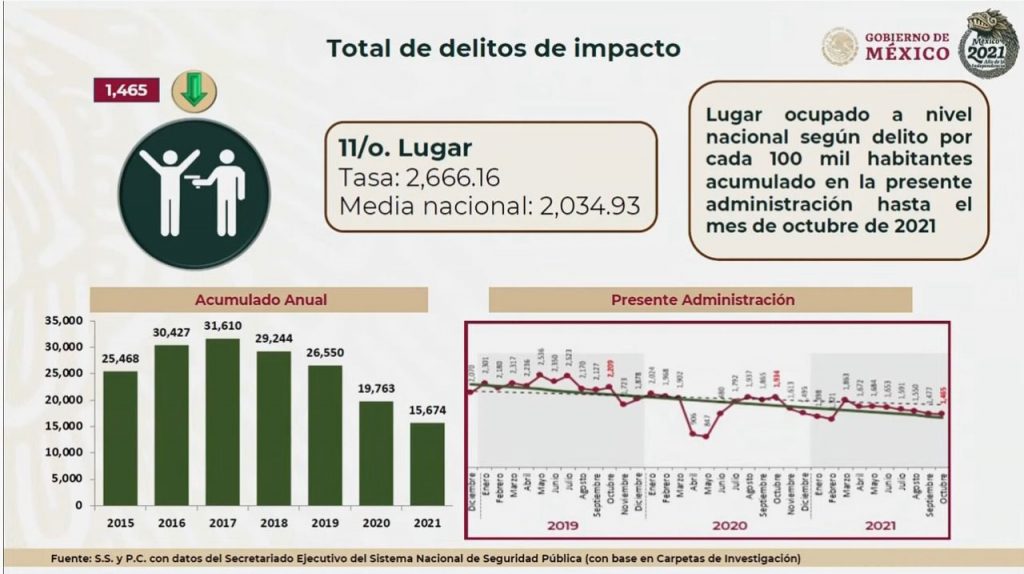 Detalló que, en el delito de secuestro, la entidad ocupa el quinto lugar a nivel nacional con una notable tendencia a la baja comparado con el 2018 en que se recibió la administración; en el robo a casa habitación el noveno; en homicidio doloso y extorsión el sitio 13; en robo de vehículos está en el sitio19; en trata de personas en el lugar 27.