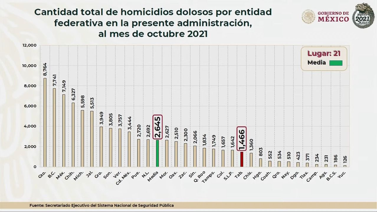 En homicidio doloso, Tabasco está en el sitio 13, por debajo de la media nacional, en todos los casos anteriores con una tendencia a la baja, afirmó en la rueda de prensa, a la que también asistió el Fiscal General, Nicolás Bautista.