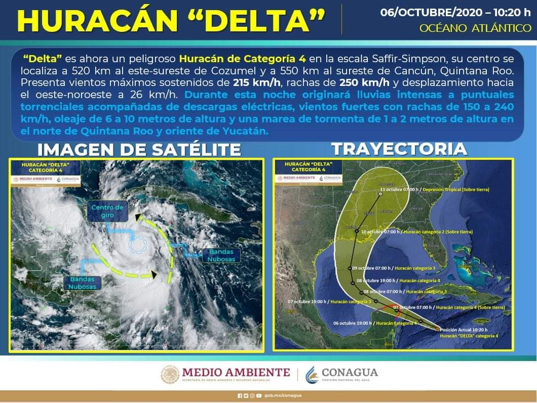 «El Huracán Delta se intensificó a Huracán Categoría 4, mantiene su trayectoria rumbo a la zona norte de Quintana Roo, se pide a la ciudadanía extremar precauciones y mantenerse informada a través de las fuentes oficiales», informó Protección Civil Estatal.