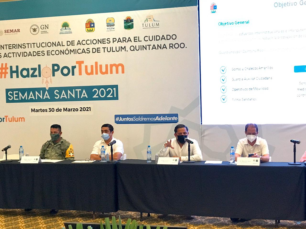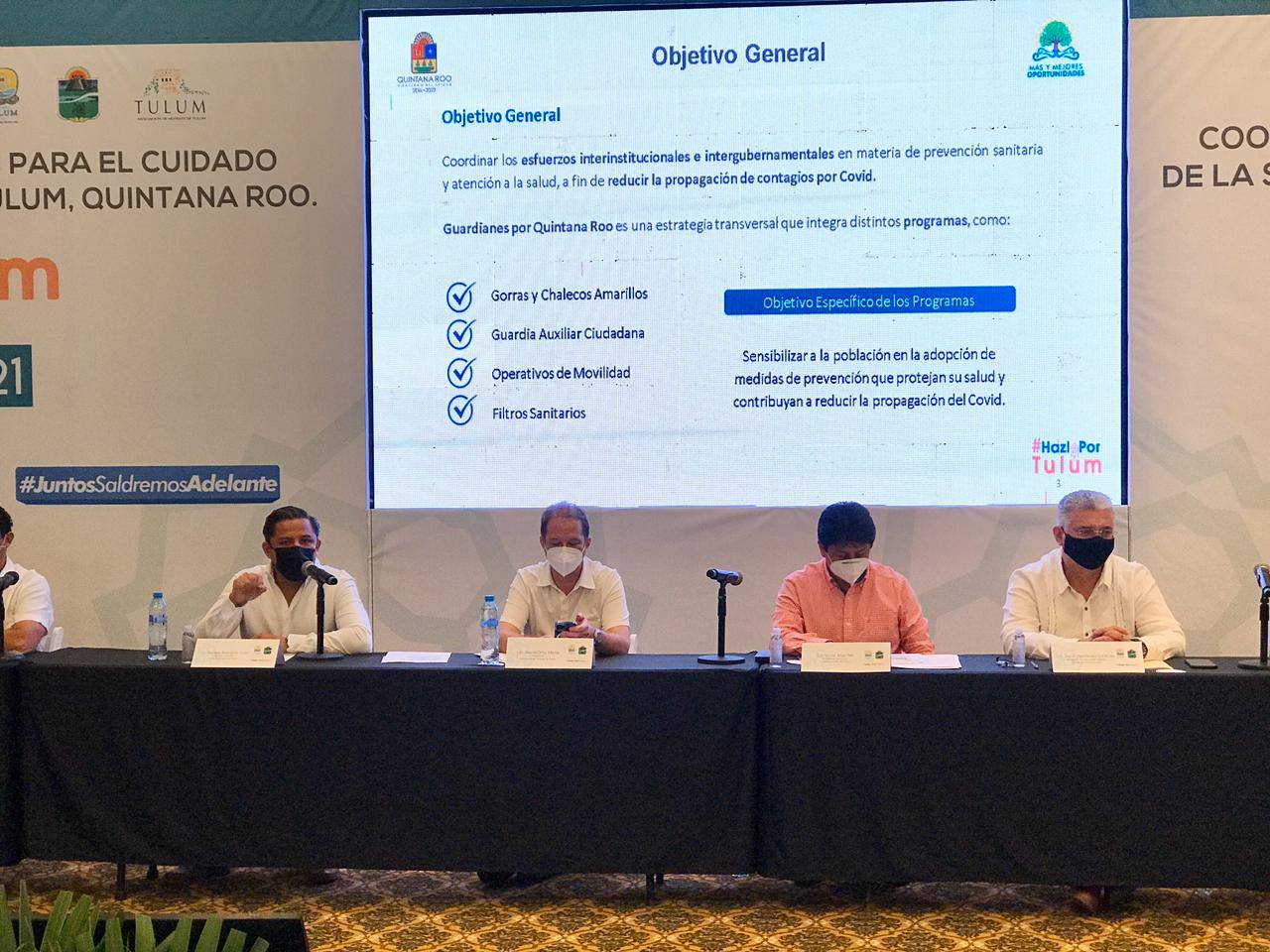 El evento, llamado “Coordinación interinstitucional de Acciones para el Cuidado de la Salud y las Actividades Económicas de Tulum”, estuvieron presentes Alfredo Suárez Camacho, encargado del programa Burbuja de Protección; el encargado del despacho de la Secretaría de Seguridad Pública, Lucio Hernández Gutiérrez; Rodolfo Reyes Carrillo en representación de la Guardia Nacional; Alfredo Salazar de en representación de la Secretaría de la Defensa Nacional; Alfonso Basto Flores de la COFEPRIS; Carlos Rodríguez Loeza, de Sefiplan; David Ortiz Mena, presidente de la Asociación de Hoteles de Tulum (AHT) y Enrique Rodríguez Luna, secretario general del Ayuntamiento.