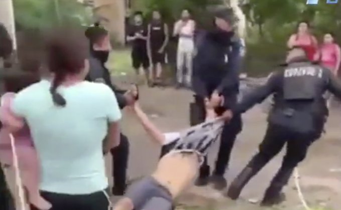Fueron por lo menos cuatro uniformados los que realizaron la detención del sujeto, al cual arrastran hasta la patrulla sujetando por sus cuatro extremidades cual si de un bulto se tratara, en medio de los gritos e insultos de familiares y vecinos.