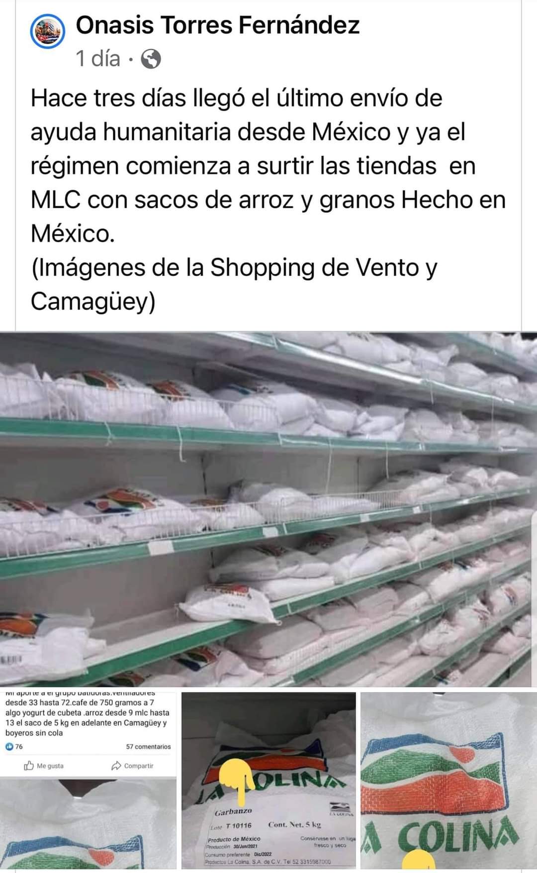 “Hace tres días llegó el último envío de ayuda humanitaria desde México y ya el régimen comienza a surtir las tiendas en MLC con sacos de arroz y granos Hecho en México”.