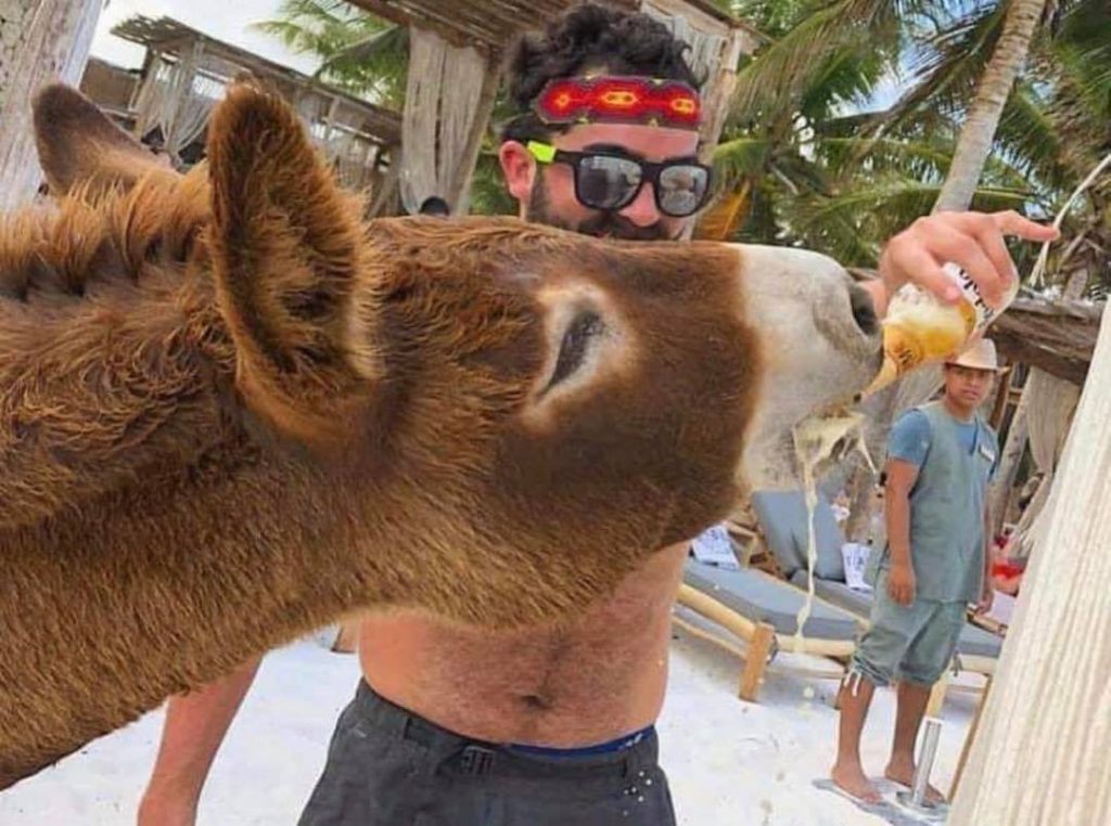 Tulum, Q. Roo, sábado 28 de Noviembre de 2020, poderycrítica.- Con el título “¡Lo emborrachan hasta que no puede más!”, Arturo Islas Allende posteó en sus redes sociales una denuncia sobre el presunto maltrato que le dan a un burro llamado “Sancho” en el Hotel “Zulum” de este municipio, pues como atractivo turístico los visitantes le “invitan” cervezas al animal.