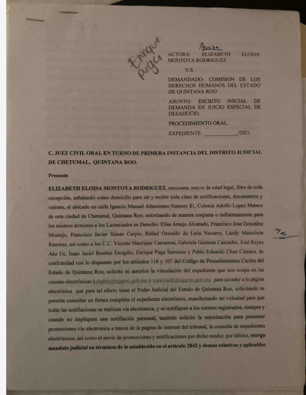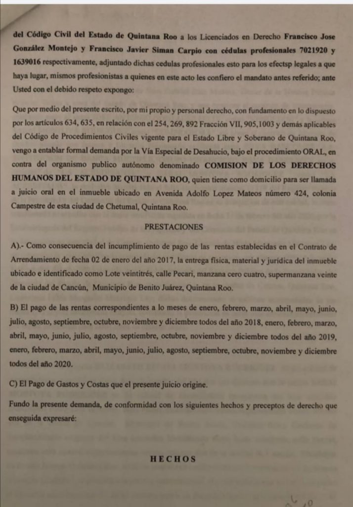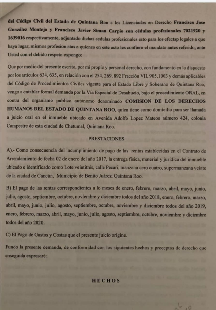 “Todo ello se circunscribe a una brutal falta de respeto a mi persona y mi dignidad que culminó cuando de la forma más siniestra, injusta e inhumana, mediante oficio número CDHEQROO/PR/279/2021 (ANEXO 1), por él signado en su carácter de presidente de la Comisión de los Derechos Humanos del Estado de Quintana Roo, notificado con fecha 15 de septiembre de 2021 y con efectos a partir del mismo día, me dio a conocer la terminación de los efectos de mi nombramiento como Directora General de la Consultoría Jurídica de esa Institución que preside, violentando mis derechos”, expresó.