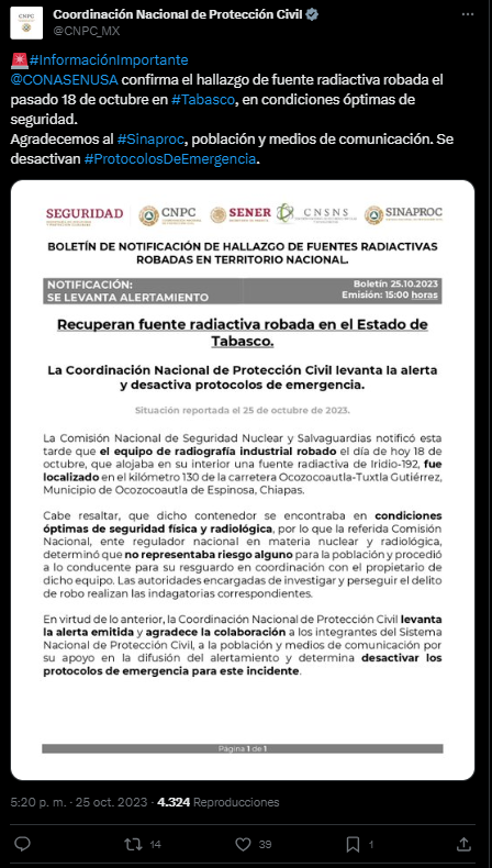 Por su parte, la Comisión Nacional de Seguridad Nuclear y Salvaguardias (CNSNS) notificó que el equipo de radiografía industrial robado el pasado 18 de octubre, que alojaba en su interior una fuente radiactiva de Iridio-192, fue localizado en el kilómetro 130 de la carretera Ocozocoautla-Tuxtla Gutiérrez, Municipio de Ocozocoautla de Espinosa, Chiapas.