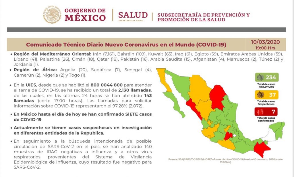 En su informe vespertino sobre el estatus que guarda la enfermedad en el país, el director general de Epidemiología, José Luis Alomía Zegarra, indicó que se mantienen siete casos de Coronavirus , 24 casos sospechosos y 201 negativos, entre estos el de Cancún.