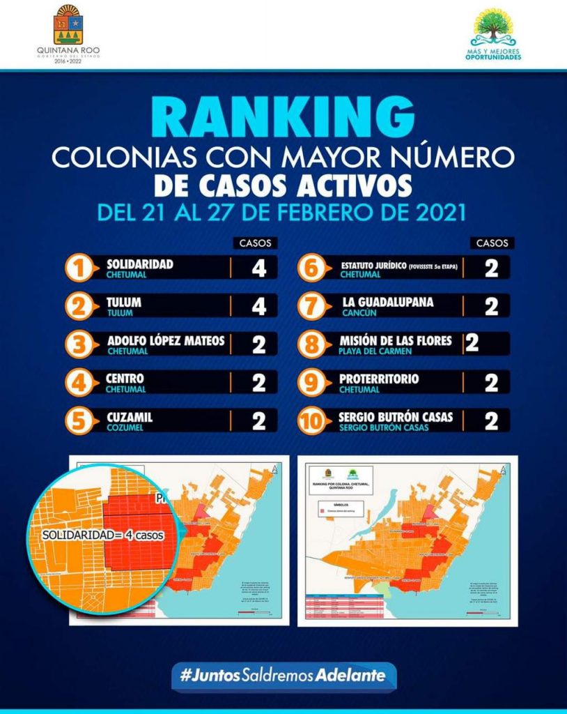 En la tabla del ranking de contagios activos de COVID-19 se mencionó que en Chetumal en la colonia Solidaridad hay 4 casos, Tulum 4 casos, Adolfo López Mateos en Chetumal con 4, colonia Centro de Chetumal con 2 casos, Cuzamil en Cozumel con 2, Estatuto Jurídico de Chetumal con 2 casos, La Guadalupana en Cancún con 2 casos, Misión de las Flores en Playa del Carmen con 2 casos, Proterritorio en Chetumal con 2 casos y Sergio Butrón Casas con 2 casos.