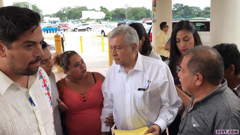 Al llegar a la terminar aérea, López Obrador fue abordado por un grupo de personas quienes le entregaron peticiones, e inclusive de manera breve se detuvo para escuchar a una mujer que le pidió apoyo para que su hijo pudiera ingresar a la Marina.
