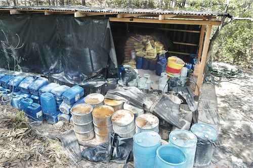 Los militares realizaron una revisión más detallada del sitio y aseguraron 14 reactores para síntesis orgánica con tubos condensadores, 13 bidones con sustancias químicas y 20 costales con sosa cáustica.
