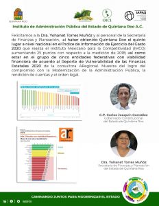 Chetumal, Q. Roo, Miércoles 16 de Diciembre del 2020, poderycrítica.- En su Informe Estatal del Ejercicio del Gasto (IEEG 2020) Reporte de Contabilidad Gubernamental, que elabora el Instituto Mexicano de Competitividad (IMCO), Quintana Roo destacó en el Quinto Lugar Nacional de entre las 32 entidades federativas.