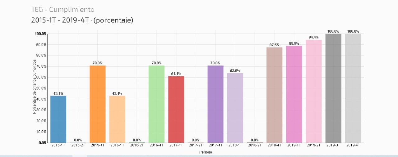 En su reporte el IMCO destaca que de 2018 al 2019, Jalisco fue la entidad que más incrementó su puntaje de cumplimiento (43 puntos porcentuales); le siguen Baja California con 38 puntos y Quintana Roo con 25 puntos. Por el contrario, la entidad que más disminuyó su calificación fue Chihuahua (7 puntos porcentuales).