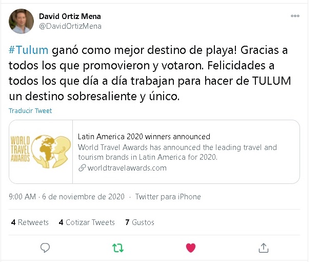 Tulum, Q. Roo, Viernes 06 de noviembre de 2020, poderycrítica.- “Tulum ganó como mejor destino de playa! Gracias a todos los que promovieron y votaron. Felicidades a todos los que día a día trabajan para hacer de Tulum un destino sobresaliente y único”, anunció esta mañana David Ortiz Mena, presidente de la Asociación de Hoteles de Tulum.