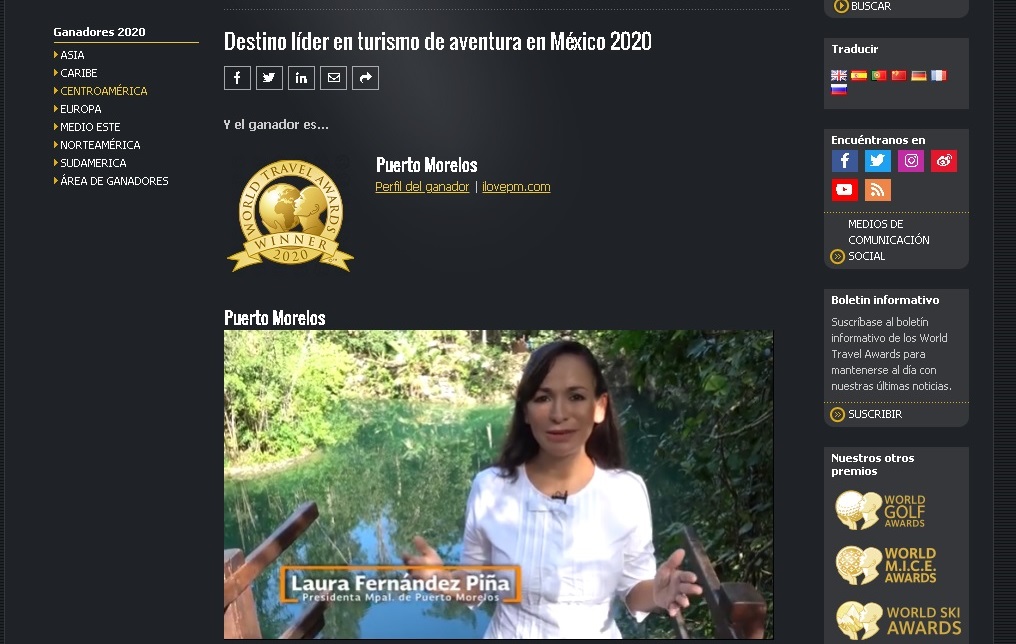 México ganó una serie de premios, donde destacan los otorgados a los quintanarroenses, por ejemplo el premio como “Destino de playa líder en México y América Central” fue para Tulum; el “Destino líder en turismo de aventura en México”, otorgado a Puerto Morelos y Río Secreto en la categoría “Reserva Natural Líder de México y Centroamérica”.