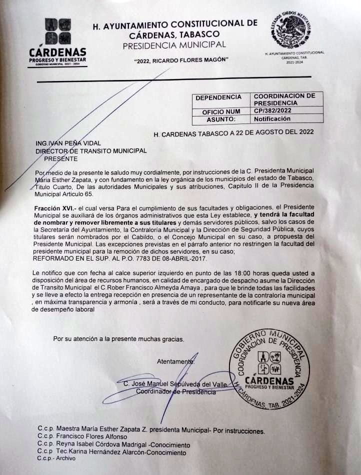 En un oficio enviado por la presidenta municipal de Cárdenas, María Esther Zapata se lee: “Le notifico que con fecha al calce superior izquierdo en punto de las 18:00 horas queda usted a disposición del área de recursos humanos, en calidad de encargado de despacho asume la dirección de Tránsito Municipal el C Rober Francisco Almeyda Amaya, para que le brinde todas las facilidades y se lleve a efecto la entrega recepción en presencia de un representante de la contraloría municipal, en máxima transparencia y armonía”.