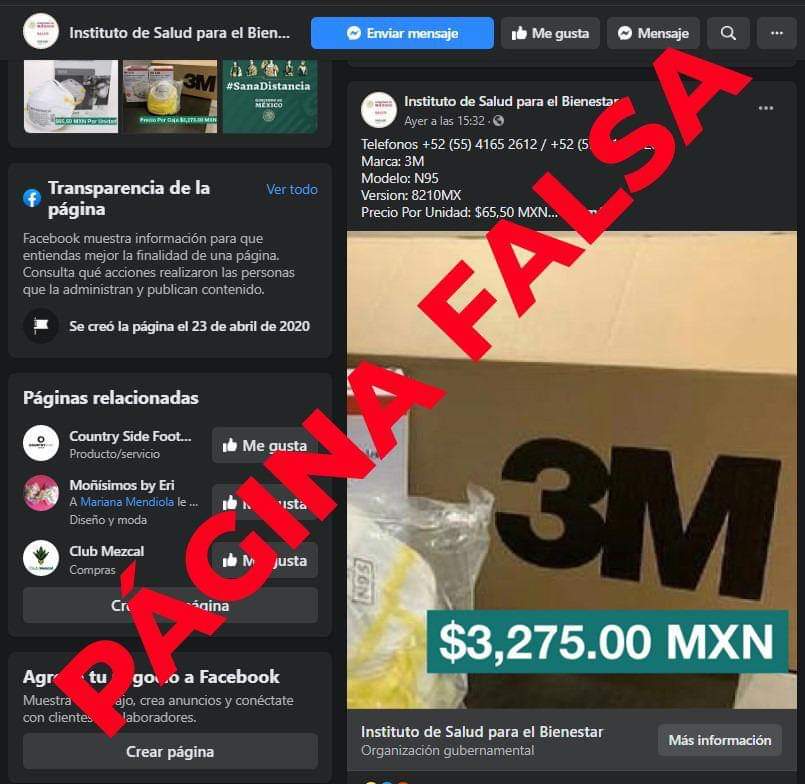 Ciudad de México, Miércoles 29 de Abril de 2020, poderycrítica.- El Instituto de Salud para el Bienestar detectó en Facebook una página apócrifa del Insabi en la que se venden insumos médicos, por lo que pide a los ciudadanos no dejarse sorprender y evitar ser víctimas de un fraude.