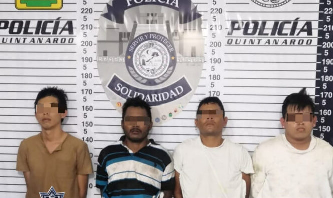 Una tarjeta informativa de la corporación añadió que Eduardo “N” de 22 años de edad y Fernando “N” de 37 años de edad, originarios de Veracruz, así como Carlos “N” de 36 años de edad y Melquisedet “N”, de 22 años de edad, originarios de Tabasco, fueron asegurados cuando escapaban sobre la barda de una empresa de gas, ubicada en la avenida 125 con calle 25 sur, señalados por los guardias de seguridad, de tratar de robar una caja fuerte.