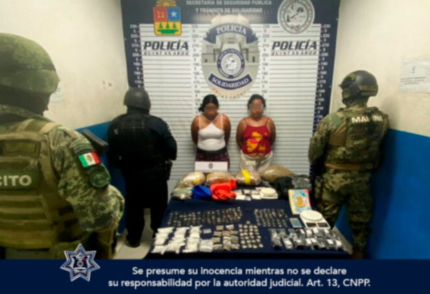 Poder y Crítica | Redacción | Duro golpe al narcomenudeo a través de un operativo conjunto del Grupo de Coordinación para la Construcción de Paz y Seguridad en Quintana Roo, en el que fueron aseguradas dos mujeres en posesión de una réplica de arma de fuego, 174 bolsitas y ocho paquete con posibles narcóticos en la colonia Palmas 2.