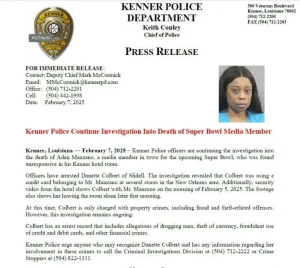 El viernes por la mañana (7 de febrero), la policía de Kenner anunció que había arrestado a Danette Colbert, de Slidell, después de descubrir que supuestamente estaba usando la tarjeta de crédito de Manzano en varias tiendas en el área de Nueva Orleans.