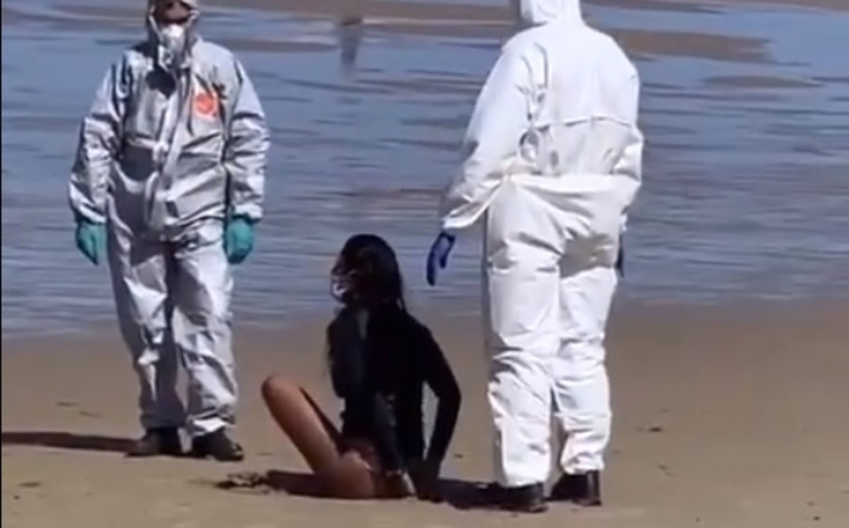 España, 09 septiembre; poderycritica.-Una surfista fue detenida luego de que acudiera a la playa sabiendo que tenía COVID-19. Funcionarios tuvieron que ir en trajes especiales para detenerla y expulsarla del lugar.