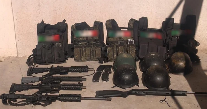 En el domicilio, las autoridades encontraron 4 armas largas, 19 cargadores de diferentes calibres, 60 artefactos explosivos de origen artesanal, 2 artefactos explosivos de pirotecnia, así como 6 chalecos tácticos, 6 cascos y 2 vehículos y 2 cascos tipo kevlar.