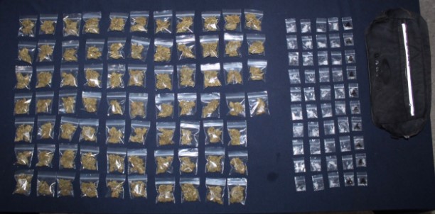 Por lo anterior, los oficiales procedieron a entrevistarse con dichas personas, solicitándoles una revisión, asegurándoles 50 bolsitas con sustancia similar al cristal, 74 bolsitas con vegetal similar a la marihuana y un bolso negro.