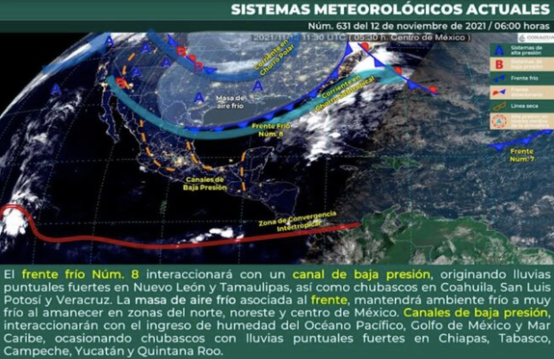 El Frente Frío No.08, localizado en superficie y se ubica sobre la porción noreste de la república mexicana, porción norte del golfo de México y hasta la porción norte de la península de Florida, EUA; genera descenso de temperaturas, nubosidad variable con nubes de tormenta, con lluvias acompañadas de chubascos con probabilidad de actividad eléctrica dispersa, viento frío y arrachado del norte y noreste, por el momento no presenta influencia para la península de Yucatán y estado de Quintana Roo.