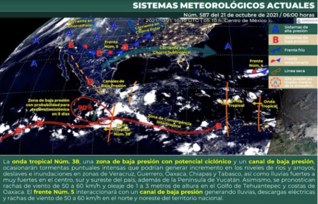 Chetumal, Q. Roo, jueves 21 de Octubre de 2021, poderycrítica.- El Servicio Meteorológico Nacional (SMN) informó que el pronóstico para la Península de Yucatán será de cielo nublado durante la tarde con lluvias muy fuertes en Campeche, así como chubascos con lluvias puntuales fuertes en Yucatán y Quintana Roo, todas con descargas eléctricas; ambiente templado por la mañana y cálido a caluroso durante la tarde; viento del noreste de 20 a 30 km/h.