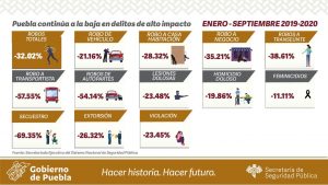 Puebla, Puebla Miércoles 21 de Octubre del 2020, poderycrítica.- A través de la estrategia de seguridad impulsada por el gobernador, Miguel Barbosa Huerta, la incidencia delictiva en el estado disminuyó entre enero y septiembre de este año en un 22.61 por ciento en comparación con el mismo periodo de 2019, de acuerdo a datos del Secretariado Ejecutivo del Sistema Nacional de Seguridad Pública (SESNSP).