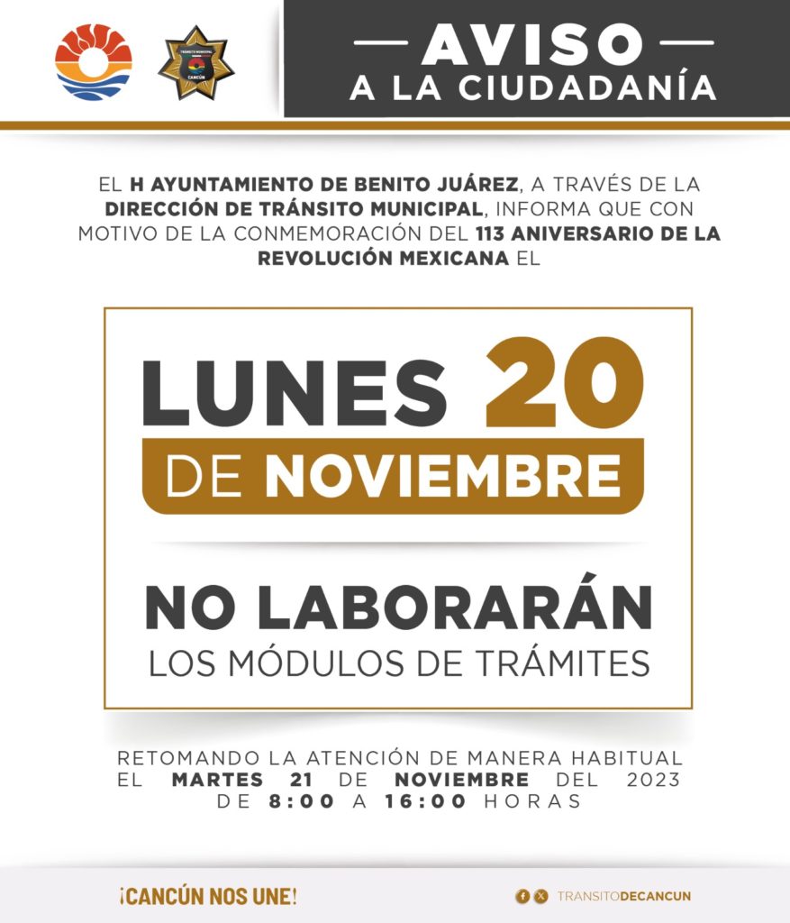 PODER Y CRÍTICA | REDACCIÓN | Debido al 113° Aniversario de la Revolución Mexicana, el Ayuntamiento de Benito Juárez, a través de la dirección de Ingresos informa que este lunes 20 de noviembre se mantendrán cerrados y sin labores todos los módulos de atención y cajas para el pago de contribuciones y trámites.