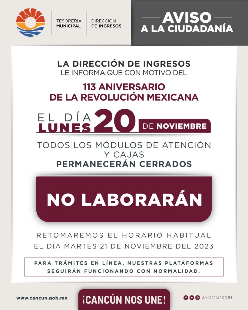 PODER Y CRÍTICA | REDACCIÓN | Debido al 113° Aniversario de la Revolución Mexicana, el Ayuntamiento de Benito Juárez, a través de la dirección de Ingresos informa que este lunes 20 de noviembre se mantendrán cerrados y sin labores todos los módulos de atención y cajas para el pago de contribuciones y trámites.