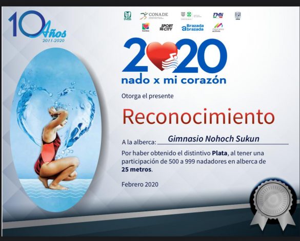 Distintivo Oro por la Alberca Semi Olímpica de la Unidad Deportiva Bicentenario y Distintivo Plata por la Alberca del Gimnasio Nohoch Sukun ambas de la capital del estado, en el evento acuático masivo más grande de México sobre la prevención de la salud, la activación física y el fomento para la detección oportuna de riesgos cardiovasculares.