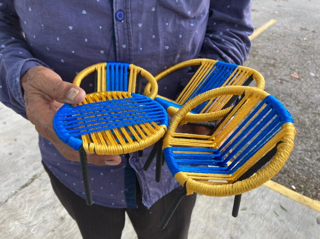 En ocaciones, don Maximiliano carga sus sillas en miniatura y los lleva a vender frente a conocido centro comercial de la avenida Lázaro Cárdenas, desde donde compartió este arte de tejer sillas tipo Acapulco.