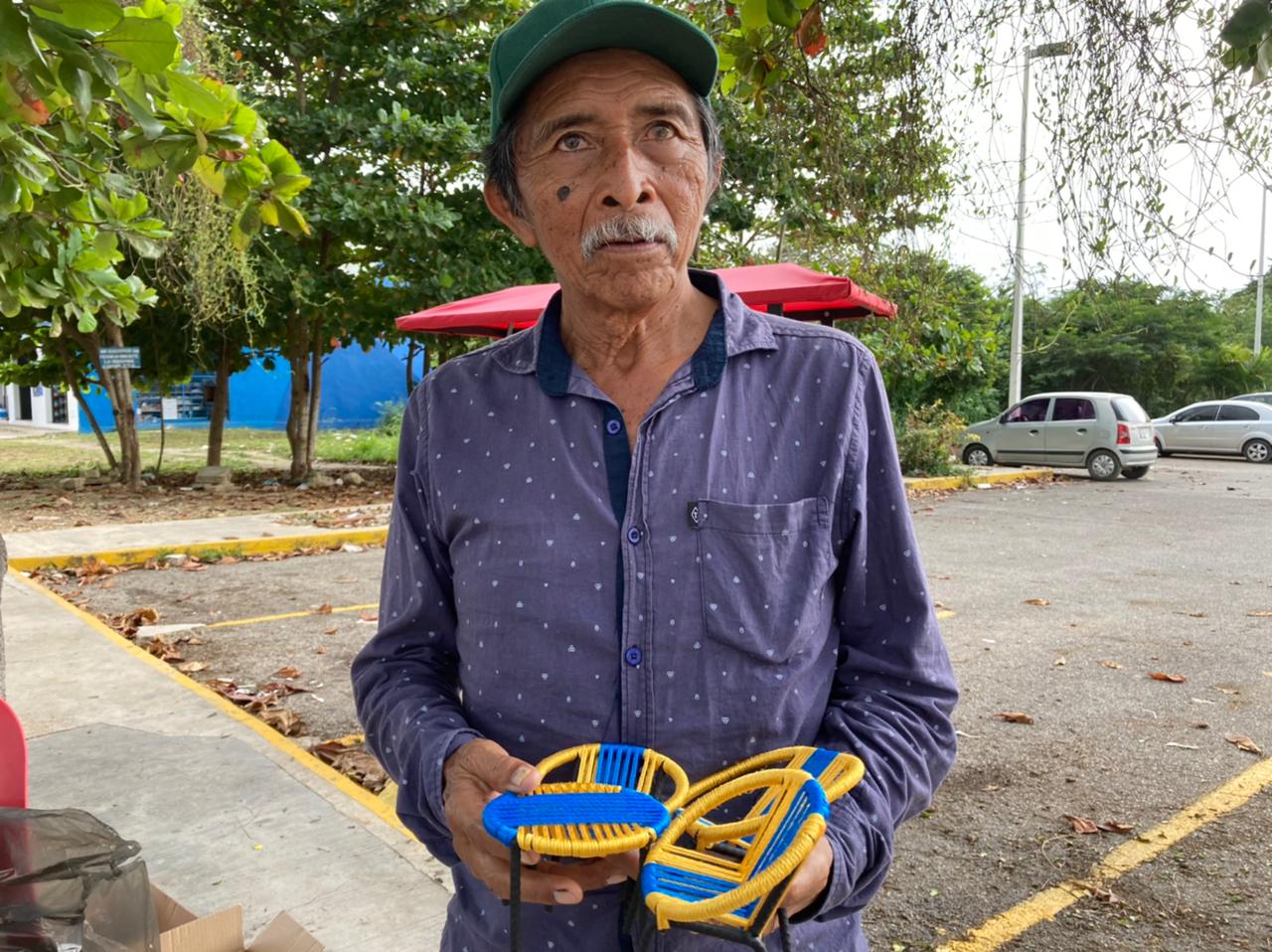 En ocaciones, don Maximiliano carga sus sillas en miniatura y los lleva a vender frente a conocido centro comercial de la avenida Lázaro Cárdenas, desde donde compartió este arte de tejer sillas tipo Acapulco.