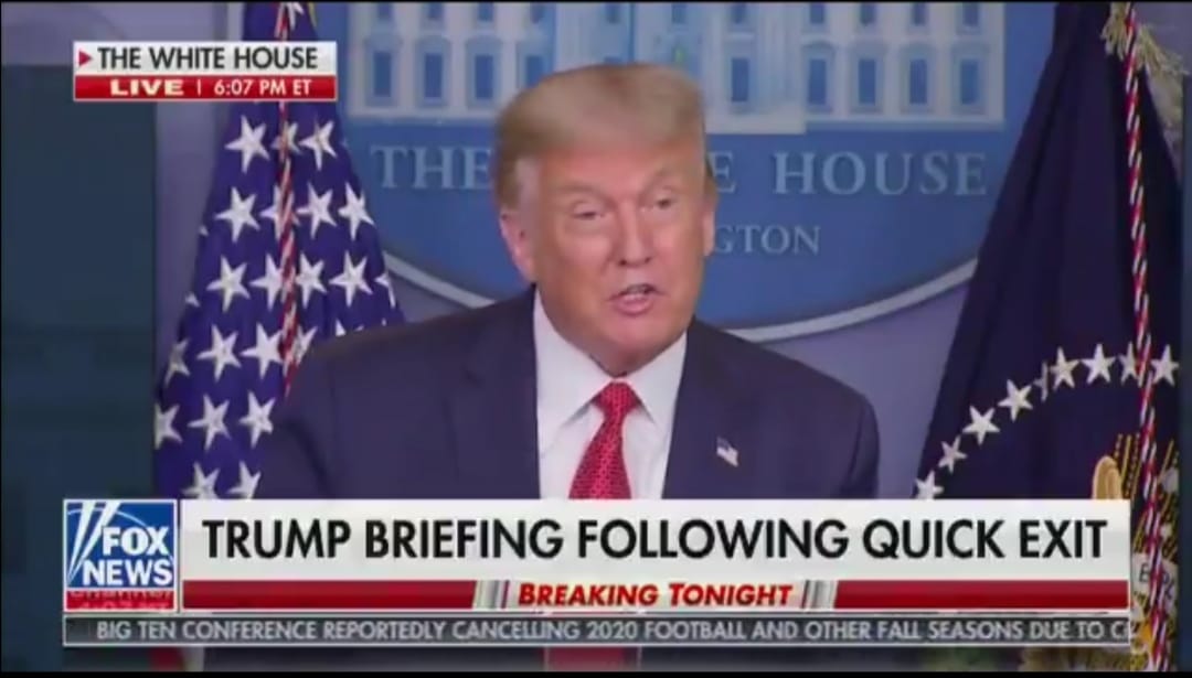 Estados Unidos, Lunes 10 de Agosto de 2020, poderycrítica.- El presidente de Estados Unidos, Donald Trump, fue evacuado de una conferencia de prensa, pues la información que se tiene de momento es que había un tiroteo fuera de la Casa Blanca.