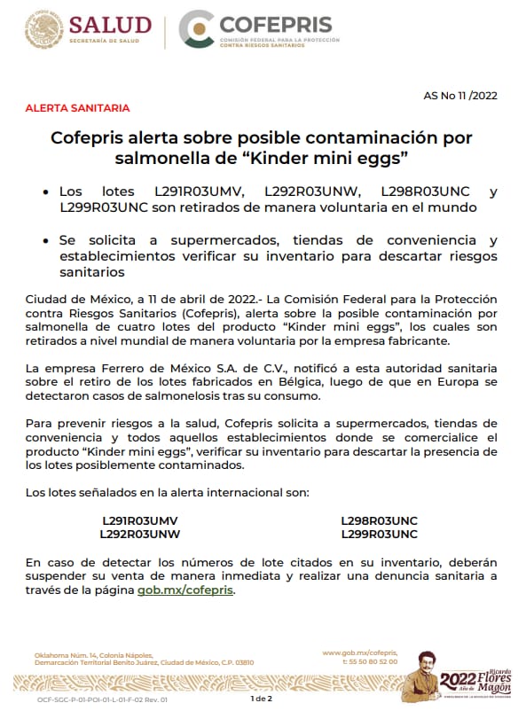 Esto luego de la empresa Ferrero de México S.A de C.V., notificara a la autoridad sanitaria sobre el retito de los lotes fabricados en Bélgica, luego de que en Europa se detectaron casos de salmonella tras su consumo.