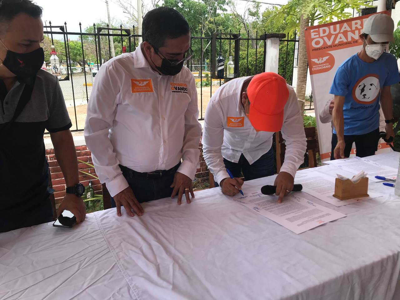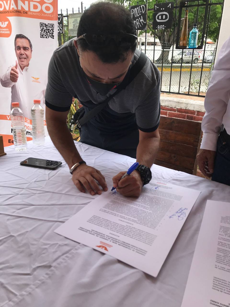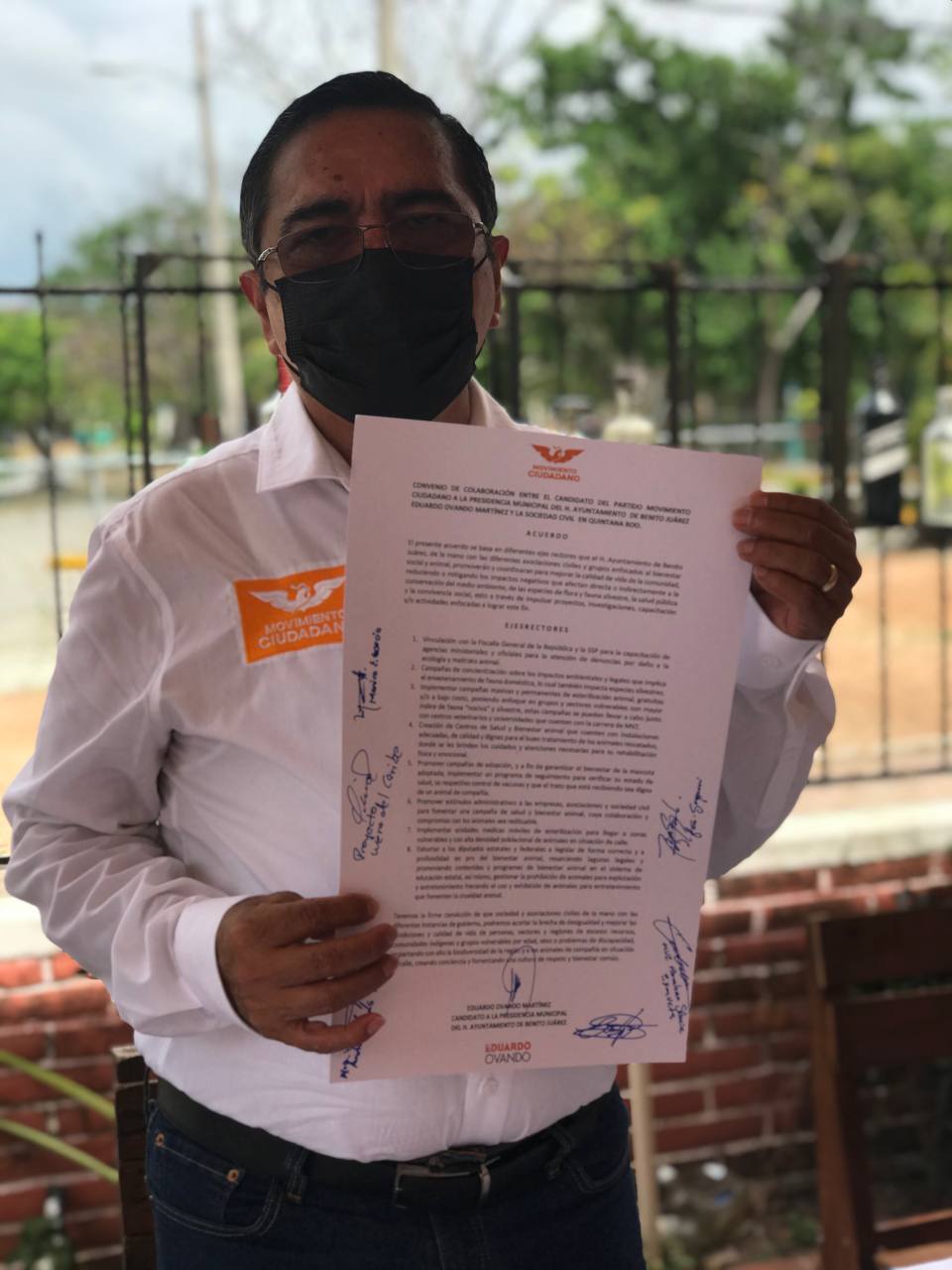 Cancún, Q. Roo, Martes 18 de Mayo de 2021, poderycrítica.- Eduardo Ovando, candidato a presidente municipal de Benito Juárez firmó un acuerdo creado en conjunto con asociaciones y ciudadanos especializados en el rescate y cuidado animal en Benito Juárez, en donde el principal objetivo es mejorar la calidad de vida de la comunidad, reduciendo o mitigando los impactos negativos que afectan directa o indirectamente a la conservación del medio ambiente, de las esencia de flora y fauna silvestre, la salud pública y la convivencia social, esto a través de proyectos, investigaciones, capacitación y actividades enfocadas a lograr este fin.